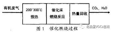 高浓度的有机废气在外力的作用下进入氧化床中,通过金属铂的催化作用,被燃烧分解为H2O与CO2,废气通过这一操作得到净化。这一燃烧过程的特征为低温、快速以及无焰,并产生较大的热量,人们可以将活性炭再次回用到有机废气的脱附与燃烧氧化中,从而降低能源消耗。具体的反应过程如图1所示。