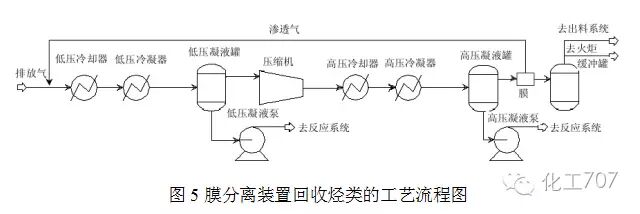 膜分离装置设于高压冷凝器之后,缓冲罐前,由于排放气压缩机能力不足,只有一部分气体经过膜分离装置,其他部分直接进入缓冲罐,渗透气返回至低压冷却器前,尾气进入缓冲罐。