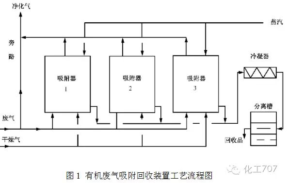 活性炭纤维吸附有机废气是当今世界上最为先进的技术之一,活性炭纤维比颗粒状活性炭具有更大的吸附容量和更快的吸附动力学性能,活性炭吸、脱附工艺流程见图1。