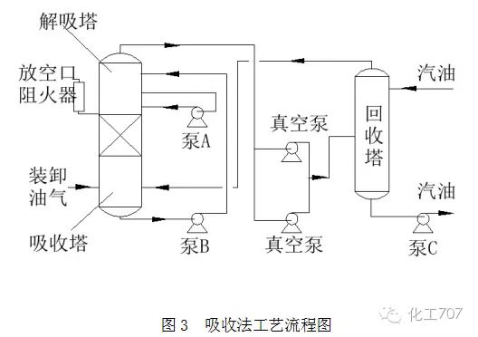 吸收法通常用于油气回收。装卸油品时产生的油气进入吸收塔,从出口排出贫油空气,解吸塔内进行吸收液的真空解吸,解吸的吸收液再循环利用,回收塔用汽油将进入的解吸气进行回收,尾气返回吸收塔重复该过程。用溶液吸收法回收挥发性有机物的吸收液通常是特殊的吸收液,吸收液的选择将影响回收效果。