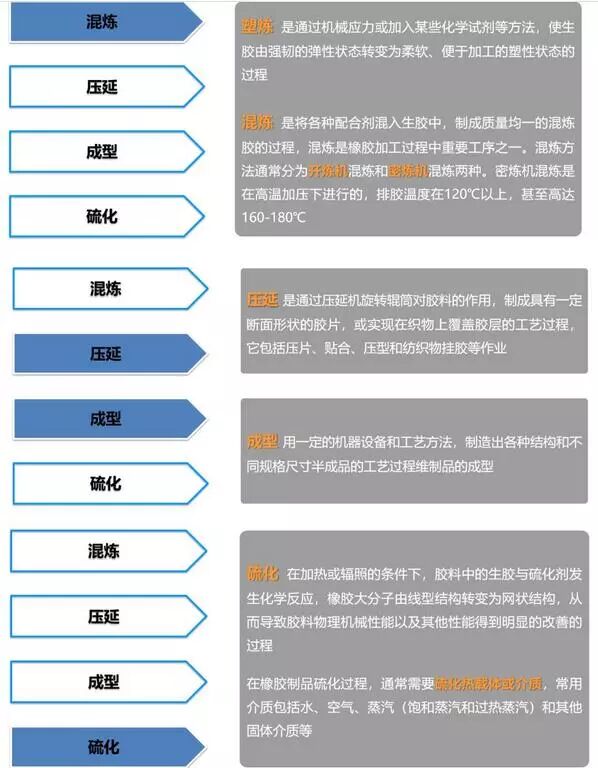 橡胶制品业是指以生胶(天然胶、合成胶、再生胶等)为主要原料、各种配合剂为辅料,经炼胶、压延、压出、成型、硫化等工序,生产主要包括轮胎、胶管、胶带、胶鞋、乳胶制品以及其他橡胶制品等各类产品;