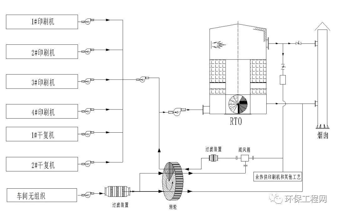 同时高浓度废气抽入RTO炉进行高温氧化焚烧,VOCs高温后分解的同时会放出大量的热能,RTO装置可以将这些热能充分的回收,再送回印刷机,节约了印刷机的干燥能耗。最终实现了即达标排放又节能增效的目标。