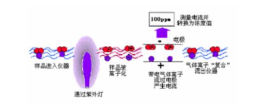 使用紫外灯(UV)光源将有机物分子电离成可被检测器检测到的正负离子(离子化)。检测器捕捉到离子化了的气体的正负电荷幵将其转化为电流信号实现气体浓度的测量。气体离子在检测器的电极上被检测后,很快会电子结合重新组成原来的气体和蒸汽分子。PID 是一种非破坏性检测器,它不会改变待测气体分子。可以实现连续实时检测。